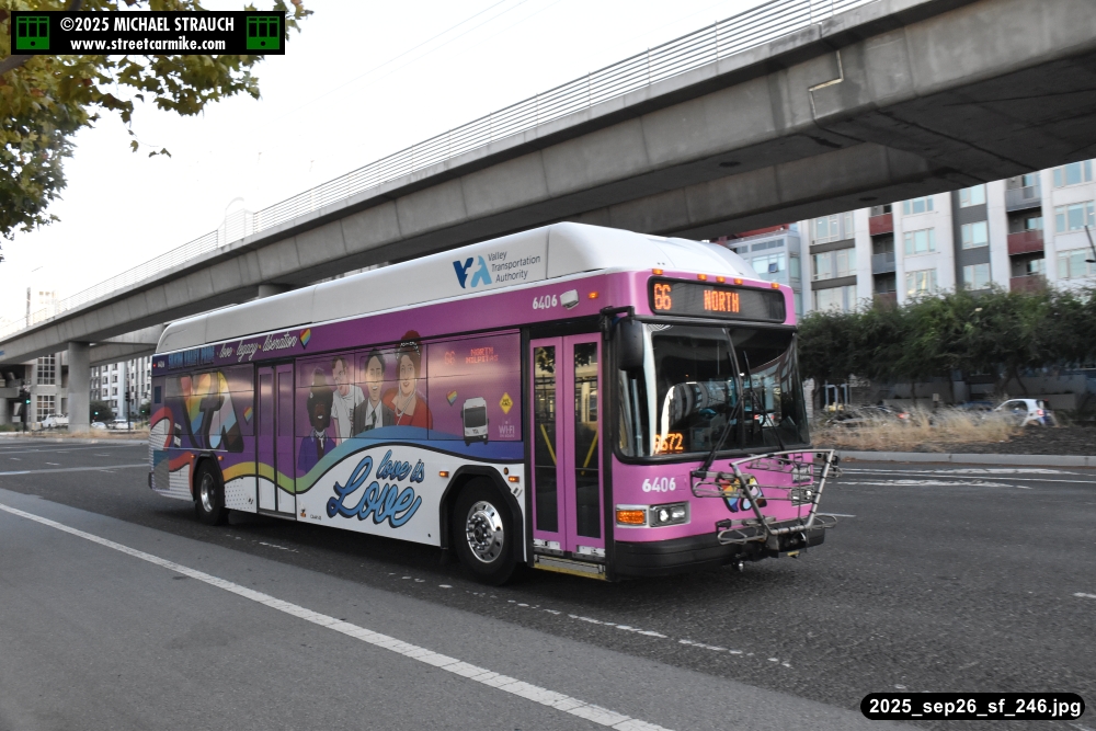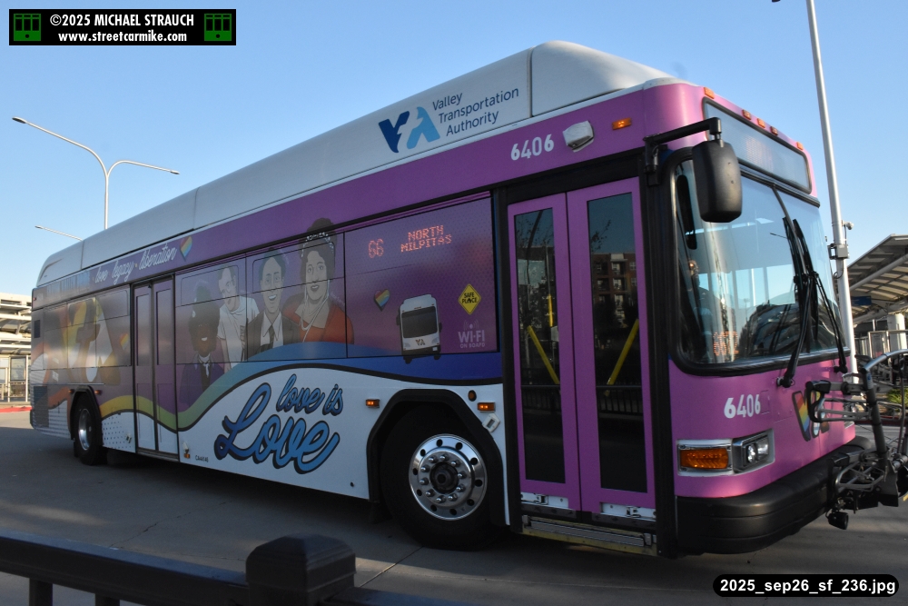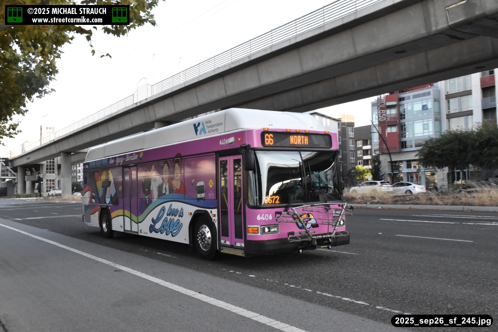 to my parked car at Milpitas Station. VTA Gillig 6406 in Pride livery was coming north on the 66,